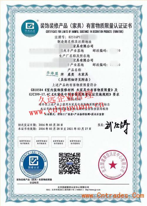家具有害物質(zhì)限量認(rèn)證證書(shū)
